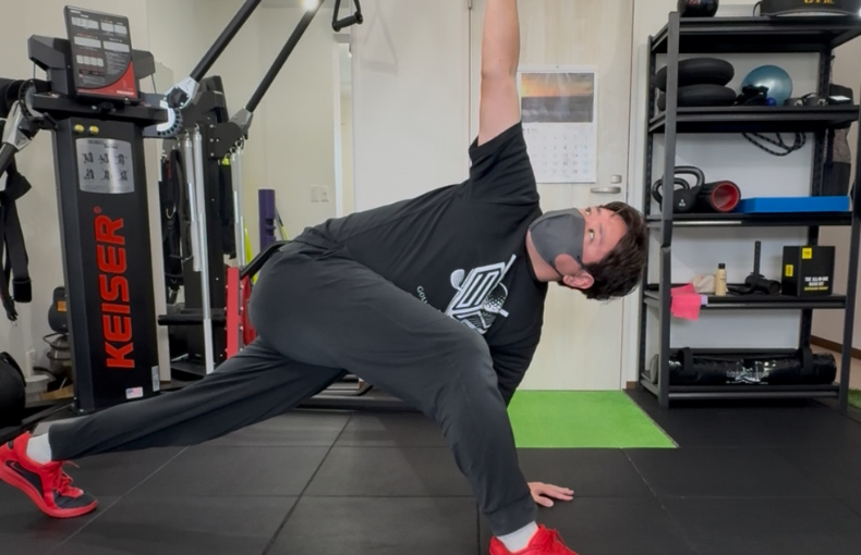 ✅ 2. 胸椎ツイストストレッチ(ワールドグレイテストストレッチ)