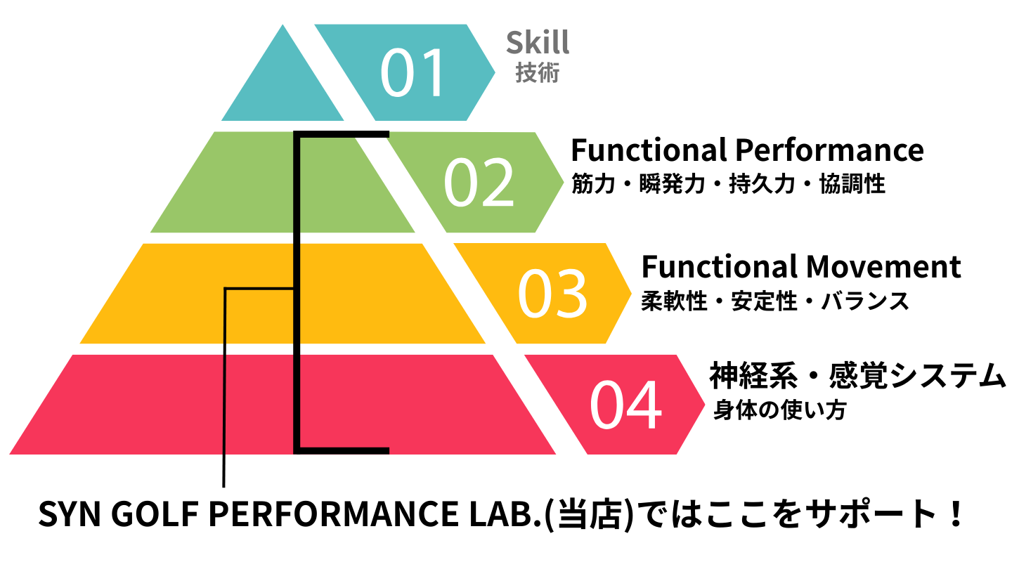 その原因は身体に根本の原因があり、柔軟性や筋力をベースとした「フォーム」と「体の使い方」にあります。どのようなスポーツでも技術を支えるのは身体の使い方や筋力、柔軟性などフィジカルの要素がバランスよく積みあがることで成り立ちます。スクールや最近ではYouTubeなどで技術を伝える機会は増える一方、土台であるフィジカルの要素は軽視されがちです。土台として安定しなければいけない身体のバランスが崩れ、本来持っている技術を活かしきれない結果として無理なフォームが続き、パフォーマンス低下のみならず身体の故障をきたします。